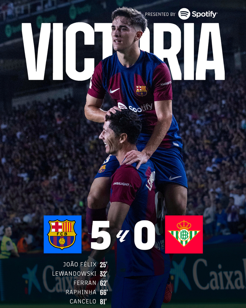 唯彩看球讯 西甲第5轮,巴萨主场对阵贝蒂斯。上半场菲利克斯收获处子球,莱万破门。易边再战,贝蒂斯门将半场伤退,费兰直接任意球破门,拉菲尼亚建功,莱万“世纪助攻”坎塞洛收获处子球。最终巴萨5-0贝蒂斯。积分榜方面,巴萨先赛一场积13分暂时登顶,贝蒂斯积7分仍暂居第八。