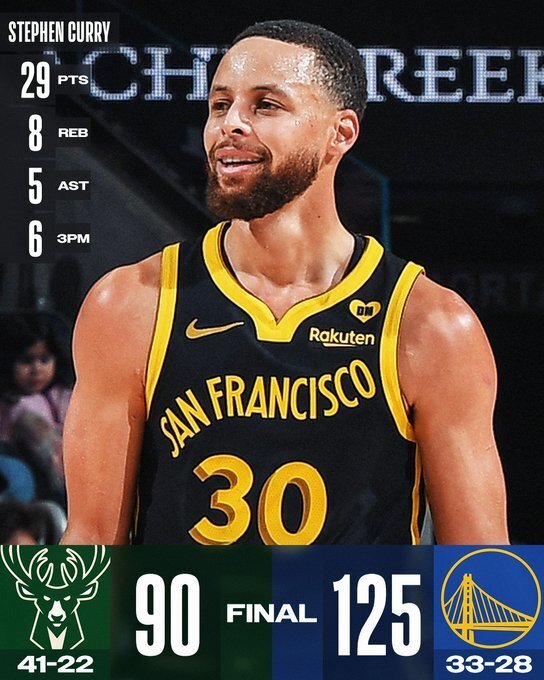 勇士(33-28):库里29分8篮板5助攻,库明加20分4篮板2助攻2断,格林12分6篮板6助攻2帽,波杰姆斯基8分7篮板3助攻,克莱10分2篮板4助攻,穆迪6分4篮板,保罗6分9助攻3断,杰克逊-戴维斯15分7篮板4帽,佩顿9分3篮板,卢尼4分,维金斯3分2篮板2助攻,基诺内斯3分4篮板。