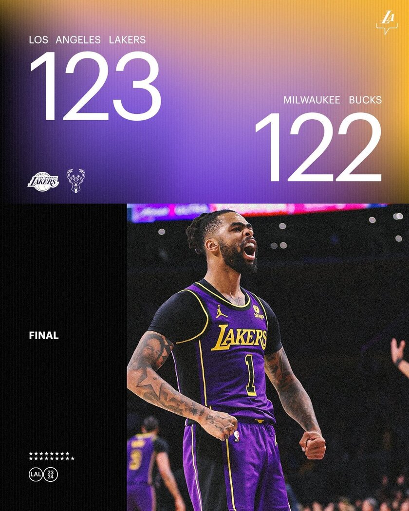 下半场,雄鹿接连3记三分追到差1分,但浓眉带领湖人一波8-0迅速稳住局势,随后字母哥和利拉德带领球队几度追到差一波分差,湖人总能回应,三节结束湖人领先6分,末节双方展开拉锯战,浓眉左肩不适,拉塞尔接连高难度三分帮助湖人守住微弱领先,比分很是胶着,字母哥中投终于反超比分,康诺顿和利拉德接连三分命中帮助雄鹿领先到6分,但八村塁和拉塞尔接连三分再止血,比赛进入白热化,拉塞尔关键2+1还保持悬念,随后拉塞尔高抛准绝杀,利拉德反绝杀中投被丁威迪帽掉,最终湖人123-122险胜雄鹿。