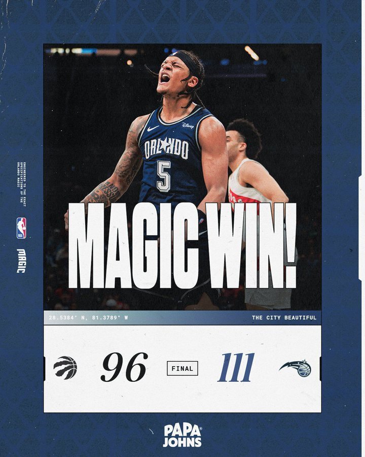 比赛上来,魔术率先发力,班凯罗带领球队打出11-4小高潮直接建立主动权,猛龙全民皆兵追分,首节魔术仅领先2分,次节双方展开拉锯战,瓦格纳兄弟相继送出暴扣,魔术重新建立领先,小瓦格纳和班凯罗半场都得分上双,魔术领先5分。下半场,魔术上来一波7-1拉开双位数领先,小瓦格纳联手班凯罗持续发力拉大分差,但猛龙也是一波小高潮止血,英格尔斯压哨三分守住14分领先,末节大瓦格纳里突外投连砍5分帮助球队继续拉大分差,魔术牢牢掌握住十几分领先,最终魔术111-96力克猛龙,拿到3连胜的同时送对手7连败。