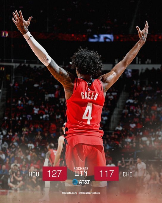 刚开场阶段双方你来我往打得十分胶着,场上比分也是交替上升,首节后半段火箭掀起一波高潮建立起两位数领先。第二节火箭一度建立起19分优势,随后道苏姆和德罗赞轮番砍分帮助公牛将比分迫近,半场结束前火箭两记三分稳住局面。下半场回来两队打得依旧十分胶着,杰伦-格林遭遇德罗赞恶犯,最后一节公牛多次反扑未果,最终火箭127-117击败公牛取得7连胜。