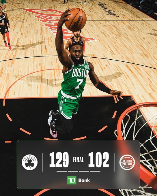 比赛开始,活塞上来打得很主动,怀斯曼非常积极首节就吃饼得分上双,而波尔津吉斯则是攻防两端撑起球队,杰伦-布朗也是内线连续强打咬住比分,首节绿军仅落后2分,次节双方展开对攻拉锯战,普理查德联手豪泽撑起进攻,活塞连续出现失误,绿军外线多点开花一度拉开20分以上领先。下半场,绿军持续发力,杰伦-布朗延续好状态里突外投单节轰17分,艾维则苦苦支撑,凯尔特人三节结束还是拉开20分以上领先,末节双方命中率都有下降,但凯尔特人还是牢牢掌握住20分左右领先,最终凯尔特人129-102轻取活塞,拿到8连胜的同时送对手5连败。