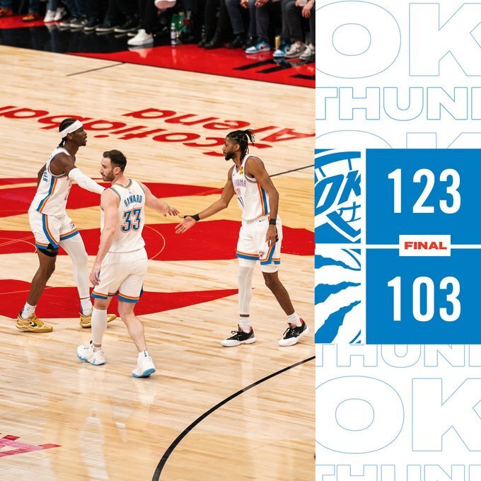 比赛开始,猛龙率先发力,内外开花打出11-2取得两位数优势,雷霆连投带罚努力追赶,次节猛龙突然断电,雷霆奋力反击轰出21-4的进攻狂潮强势反超并一度获得10分优势,半场战罢雷霆63-56领先猛龙。易边再战,雷霆牢牢占据场上主动,始终保持10分左右领先,末节雷霆持续发力扩大领先,猛龙大势已去无力回天。最终,雷霆123-103轻取猛龙,送给对手9连败。