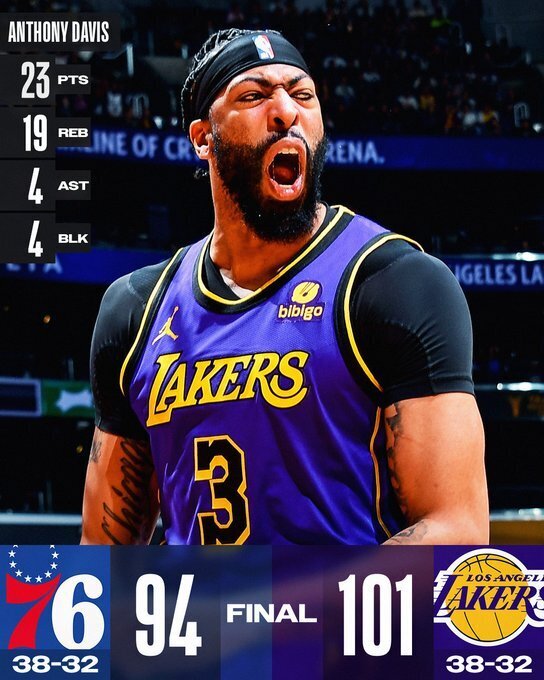 湖人(38-32):詹姆斯20分8板6助、浓眉23分19板4助4帽、里夫斯14分6板5助、拉塞尔14分5板3助、八村塁14分7板、丁威迪11分2助、海斯5分5板