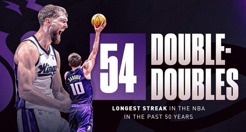 小萨博尼斯本场比赛第三节拿到11分10篮板的两双,已连续连续54场比赛斩获两双,超越凯文-乐福手握NBA和ABA合并以来的联盟最长纪录。