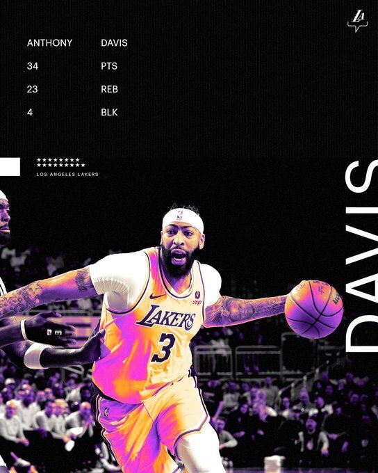 本场比赛,湖人球星浓眉在前三节表现不佳的情况下及时调整,全场出战51分52秒31投12中,三分8中3、罚球7中7砍下34分23篮板2助攻2抢断4盖帽,正负值+2。