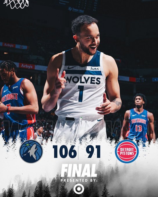 一开场,双方势均力敌,比分交替领先,森林狼连中三分占据主动,次节森林狼命中率下降,康宁汉姆依靠个人能力拿分带队反超,爱德华兹命中率不高,半场战罢森林狼47-45领先2分。下半场,双方继续缠斗,比分咬得很紧,活塞后劲不足,森林狼持续发力将分差拉开到两位数,末节双方围绕10分分差展开拉锯战,森林狼稳扎稳打保持优势,康宁汉姆拿分带队苦苦追赶无果。最终,森林狼106-91击退活塞,主场过关。