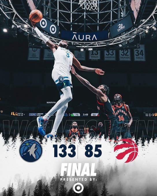 比赛上来,两队就打得比较胶着,场上比分交替领先,双方在进攻端的表现都很差,首节合计只有42分,次节森林狼的进攻终于打开,单节轰下35分后将分差拉开到两位数,半场结束时猛龙落后16分;下半场回来,场上的局势更是出现一边倒,森林狼继续将分差扩大到三十分以上,比赛彻底失去悬念,最终森林狼大胜猛龙,送给后者15连败。