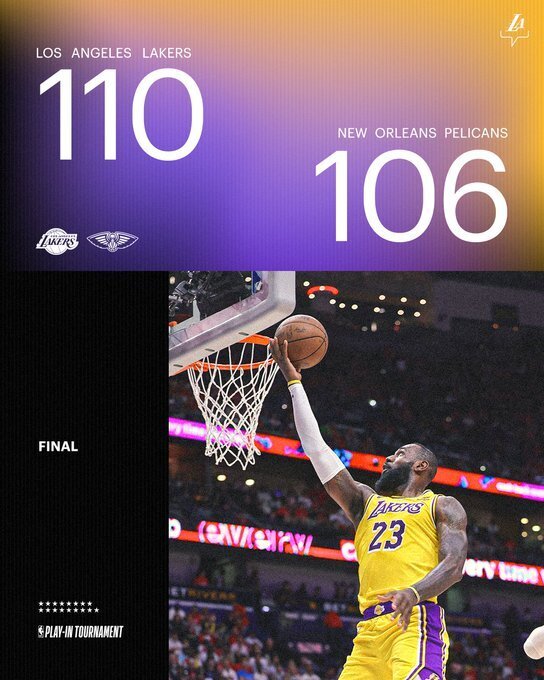 首节前半段争夺双方势均力敌交替拿分,不过进入轮换后鹈鹕逐渐占据上风,锡安末段连拿6分领衔替补阵容送出一波14-5确立起8分领先;不过次节开局湖人的替补阵容反攻回敬12-2的攻势一举扭转局势;鹈鹕虽然迅速换回主力阵容但难以找回首节状态,整个第二节仅得16分拱手让出大好局面,湖人则在末段再送13-0的攻势奠定半场10分领先。休息归来湖人延续手感再送13-5的攻势进一步拉开比分;不过后半段鹈鹕外线开火回敬19-8的攻势追至个位数保留希望;末节英格拉姆和锡安轮番带队,不过锡安的效果更好率队轰出13-2的攻势一举抹平分差;不过状态正盛的锡安突然离场返回更衣室,而拉塞尔在读秒阶段命中关键三分为湖人取得4分优势,浓眉又在随后抢下关键篮板造犯规两罚命中奠定胜。最终,湖人力克鹈鹕率先拿到季后赛名额。