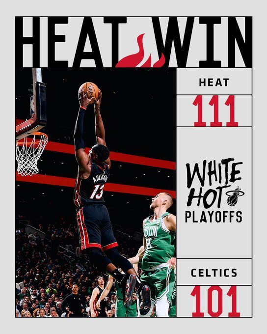 热火(1-1):希罗24分5板14助、马丁21分2板、哈克斯14分2板、约维奇11分9板6助3断、阿德巴约21分10板2助、海史密斯9分3板、赖特5分4板、邓罗6分2断