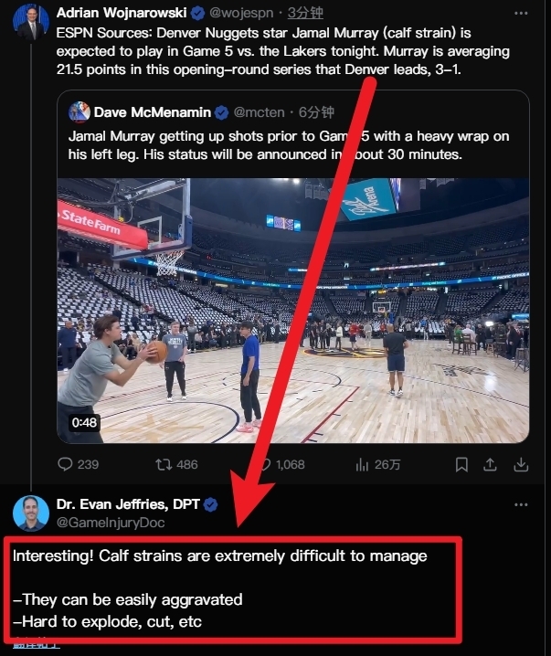 权威医学专家Evan Jeffries转发了Woj的报道并配文写道:“有趣!小腿拉伤的伤病极其难以控制。