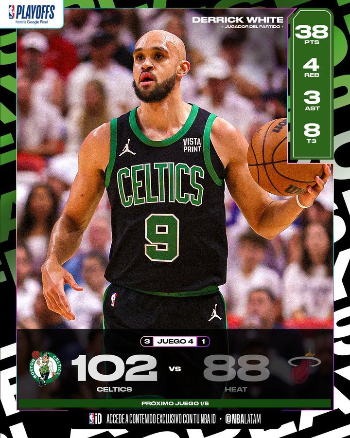 比赛开始,双方都迅速进入状态,热火全队外线不准,但怀特手感火热,尤其是外线单节轰进4记三分怒轰16分,凯尔特人建立起双位数领先,次节热火进攻端更是一言难尽单节仅得12分,外线还是没有手感,波津受伤,凯尔特人但在怀特的带领下半场还是扩大到17分领先。下半场,布朗里突外投帮助绿军拉开20分以上领先,怀特连续暴扣后继续拉大比分,热火进攻端还是状态一般,双方围绕着20几分分差展开拉锯战,末节双方都换上一些替补,希罗接连中投帮助热火追至20分以内,但霍勒迪三分加塔图姆隔扣能强势回应,热火一波7-0继续追分,但阿德巴约一级恶意犯规后怀特上篮还能回应,凯尔特人牢牢守住双位数领先,最终凯尔特人力克热火,3-1拿到赛点。
