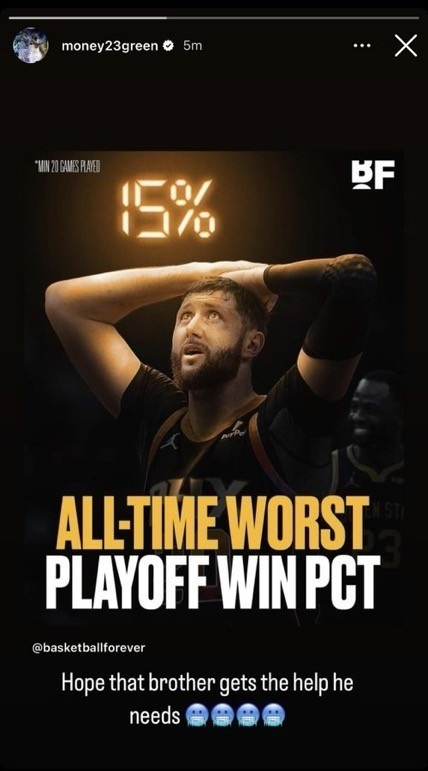 唯彩看球讯*昨日太阳被横扫出局,努尔基奇职业生涯季后赛一共3胜17负(胜率15%)。这是NBA历史上至少打过20场比赛的球员中最低的胜率。