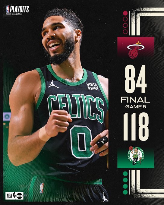 上一场状态大热的怀特将手感带到了这一场比赛,有如神助一般的他在这一节6投5中轰下15分;热火方面阿德巴约虽然状态同样神勇砍下12分,但绿军这边全面开花,他们轰出跨节44-14的进攻狂潮直接确立起30分的领先;热火虽然在这之后及时止住颓势回敬13-2的攻势,但他们无力填补大坑并带着22分的巨大劣势进入下半场。休息归来绿军没有手软继续开火,他们以一波10-0开局将优势扩大至30分以上彻底接管比赛,巨大的分差也直接杀死比赛悬念,绿军随后用高压防守完全遏制对手,末节6分钟里仅丢9分不给对手任何机会。最终,凯尔特人主场大胜热火,并以4-1的总比分击败热火晋级东部半决赛。