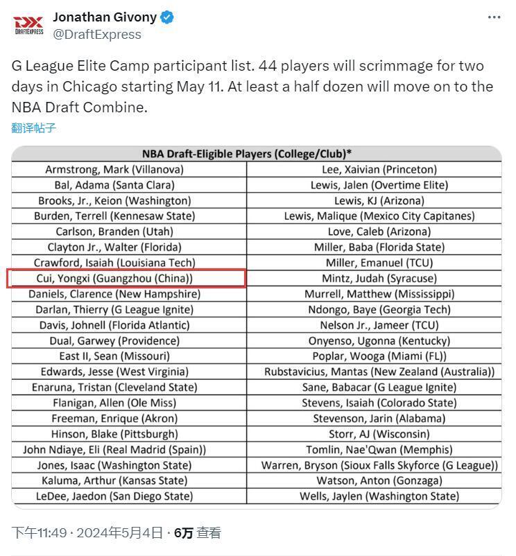 唯彩看球讯 选秀专家Jonathan Givony今日晒出了G联盟精英训练营名单,中国球员崔永熙在列(图中左列第八位)。