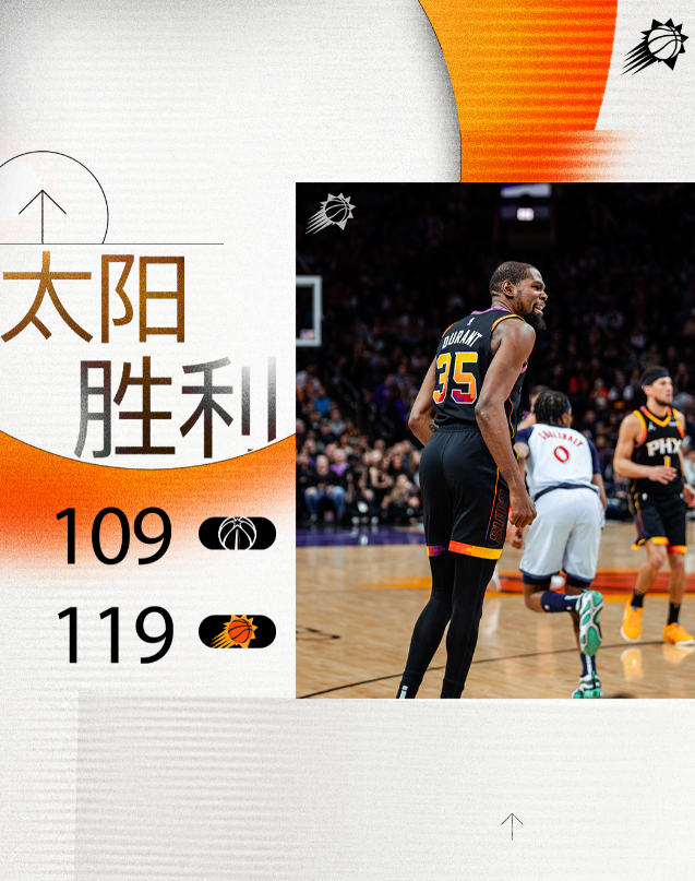 NBA常规赛焦点战,太阳队回到主场迎战奇才队。比赛中,太阳队首节便建立两位数领先,并在上半场结束前扩大到15分。下半场,奇才队一度缩小分差至4分,并在末节连续追分。但太阳队三巨头稳定局势,最终在主场以119-109击败奇才队。