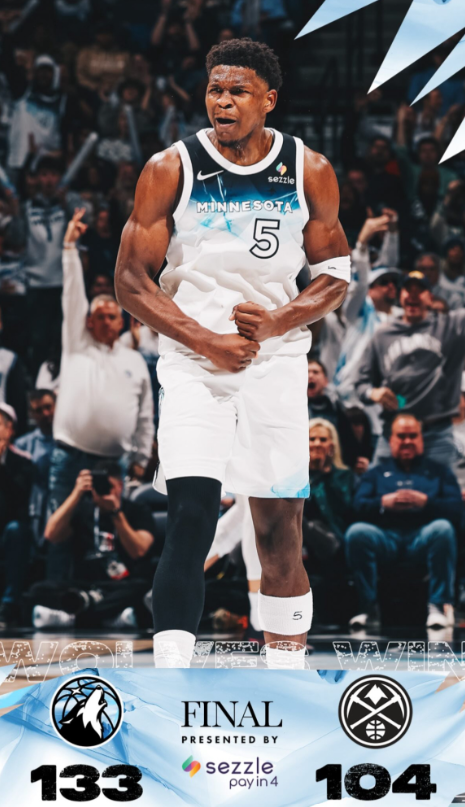 NBA常规赛,明尼苏达森林狼队以133-104大胜丹佛掘金队。半场结束时,森林狼以71-60领先。全场比赛中,森林狼队安东尼-爱德华兹砍下34分1篮板9助攻,兰德尔贡献21分7篮板7助攻。掘金队方面,贾马尔-穆雷得到25分2篮板5助攻,约基奇则贡献20分3篮板11助攻。