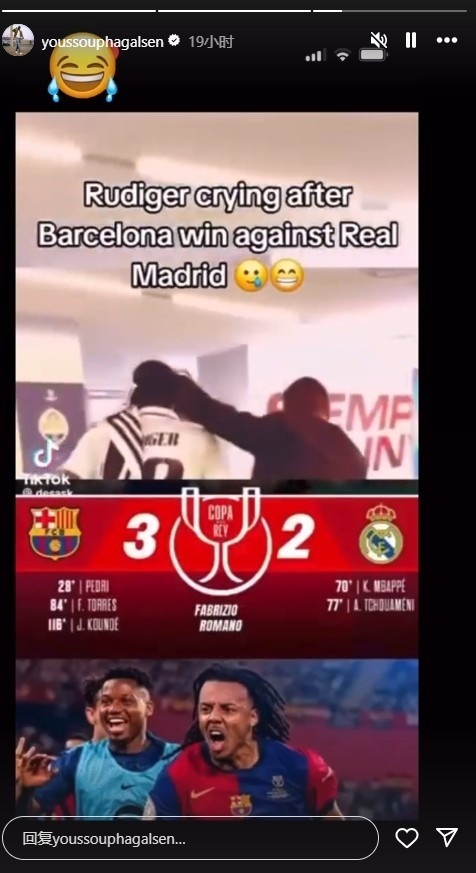 唯彩看球讯 北京时间4月29日,在巴萨3-2绝杀皇马的比赛后不久,巴萨男篮球员法尔最近在社媒上对吕迪格进行了讽刺,国王杯决赛的争议仍在继续发酵,法尔在个人Instagram账号上分享了一段吕迪格因脸部受伤返回更衣室的视频,并写道:“吕迪格在巴塞罗那战胜皇家马德里后哭泣”,还配上了大笑的表情符号。