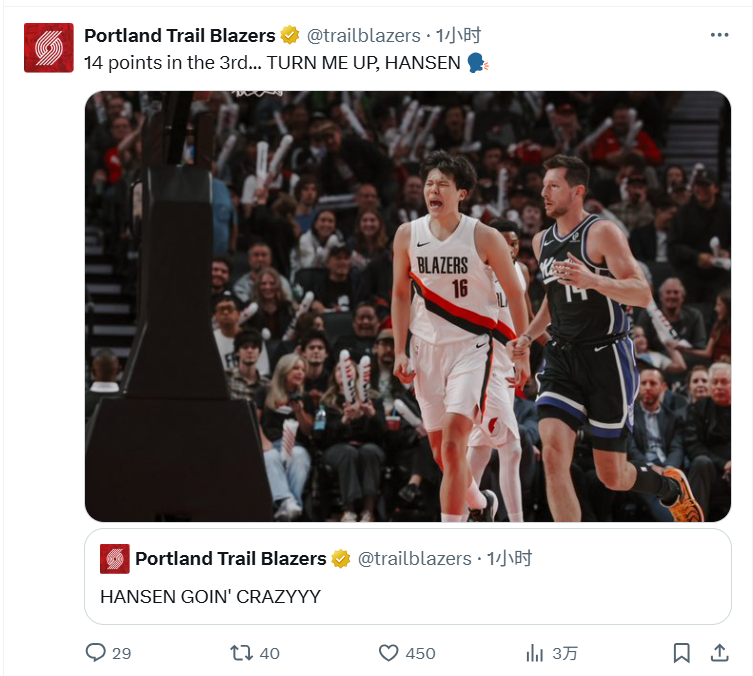 这些推文包括“瀚森连中两记三分!!!”“瀚森陷入疯狂!”“欢迎来到撕裂之城,瀚森🤝”“瀚森妙传谢登🤯这就是美丽篮球!!!”“第三节14分…加大力度,瀚森🗣️”等,还有一条推文是杨瀚森单挑尤班并配文:背后!旋转!高难度终结。开拓者官方的这些推文表达了对杨瀚森精彩表现的赞赏与激动之情。