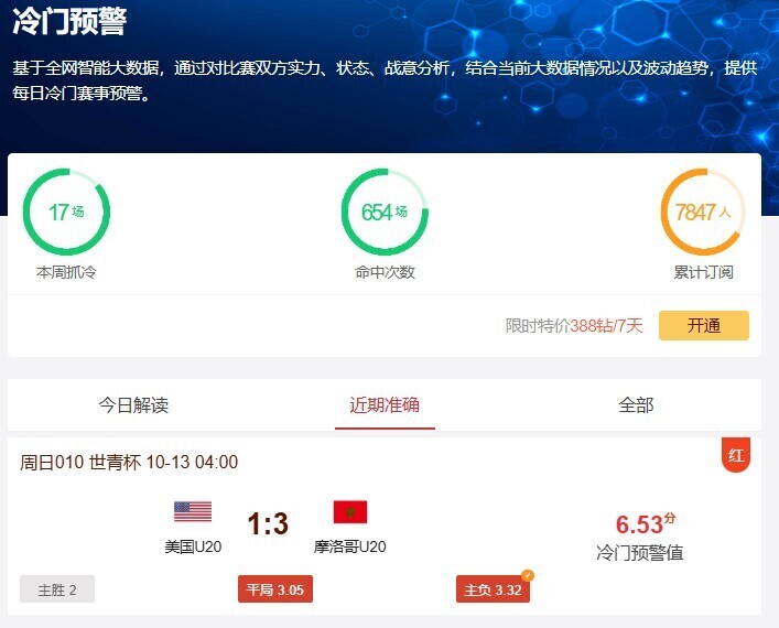 昨晚冷门预警工具再次成功预测赛果,在美国U20与摩洛哥U20的U20世界杯1/4决赛中,尽管初始赔率显示美国队占优(胜平负赔率2:3.05:3.32),但摩洛哥U20最终以3-1爆冷取胜,充分展现了我们工具的精准预测能力。
