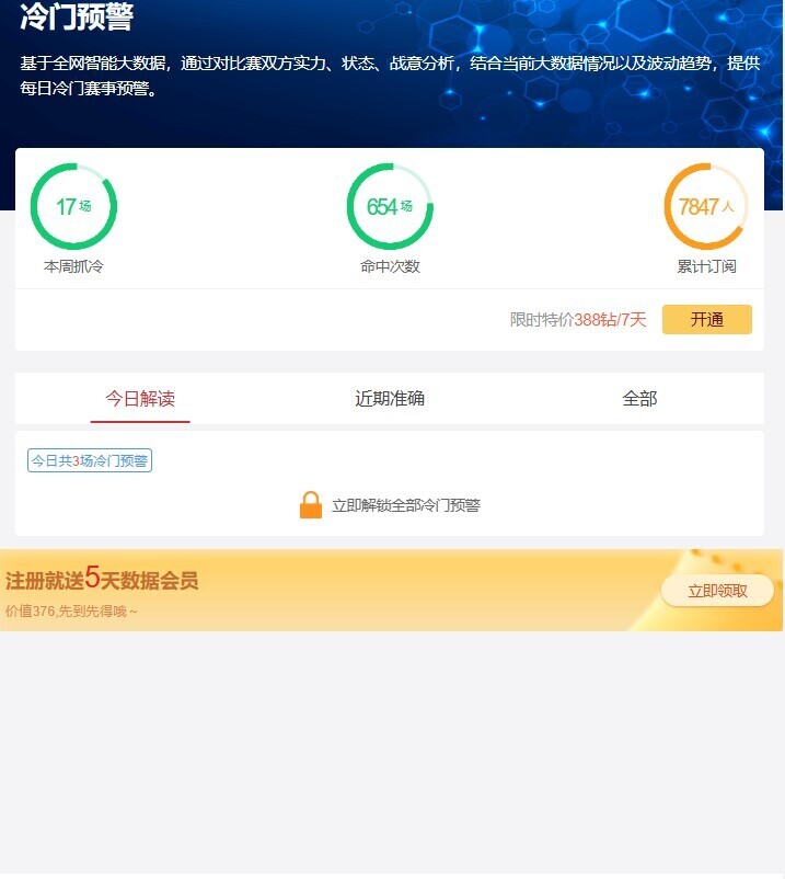 今日竞彩足球共开设7场赛事,其中不乏看似强弱分明的对决,但比赛胜负往往存在变数。目前冷门预警系统已锁定三场潜在冷门赛事,将帮助您有效规避竞彩路上的陷阱。新用户现在还可免费领取价值376元的5天数据会员服务,欢迎点击下方文字立即获取,助您竞彩投注更加得心应手。
