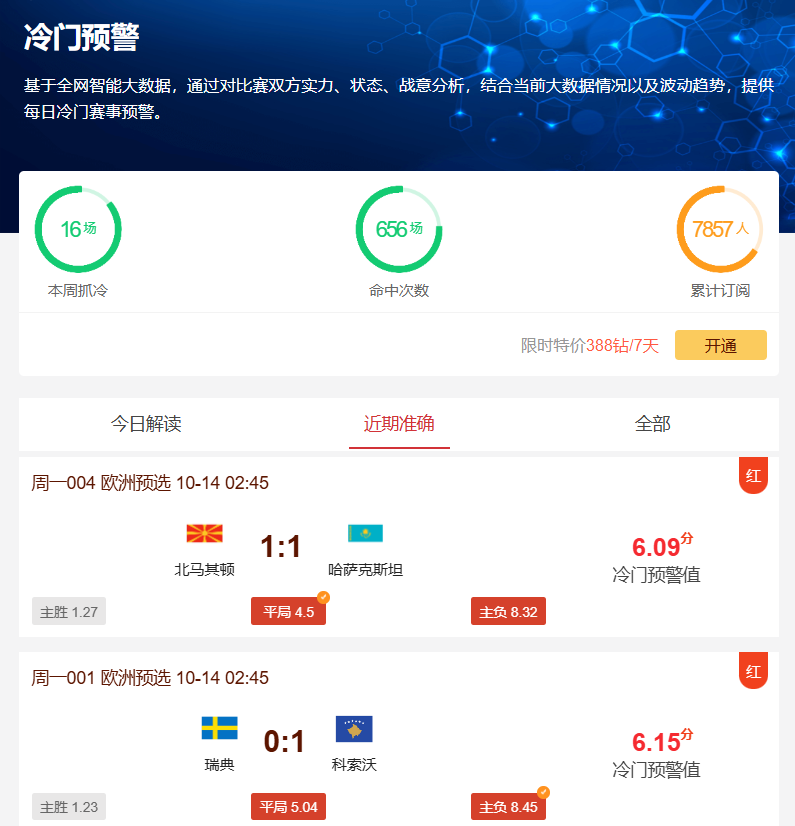 昨晚冷门预警工具再次成功预测2场比赛赛果,在北马其顿VS哈萨克斯坦的欧洲预选赛中,尽管初始赔率显示北马其顿占优(胜平负赔率1.27:4.5:8.32),但哈萨克斯坦最终以1-1爆冷逼平;瑞典VS科索沃也同样是0-1爆出了8.45赔率主负的大冷,两场预测充分展现了我们工具的精准预测能力。