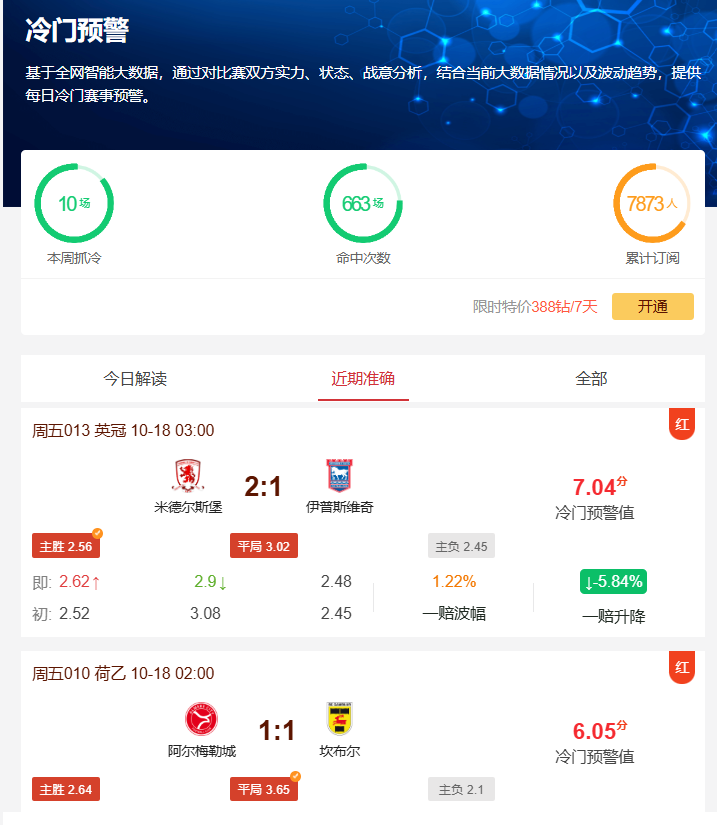 昨晚冷门预警工具再次成功预测6场比赛赛果,在杜塞尔多夫VS不伦瑞克的德乙比赛中,尽管初始赔率显示杜塞尔多夫占优(胜平负赔率1.66:3.65:3.95),但不伦瑞克最终以2-1爆冷取胜;汉诺威96VS沙尔克04也同样是0-3爆出了3.52赔率主负的大冷;早场日职神户胜利船0-0战平鹿岛鹿角的3.26赔率冷门同样命中。还有英冠米德尔斯堡2-1伊普斯维奇、荷乙阿尔梅勒城1-1坎布尔、法乙罗德兹2-2兰斯均抓冷成功。六场预测充分展现了我们工具的精准预测能力。