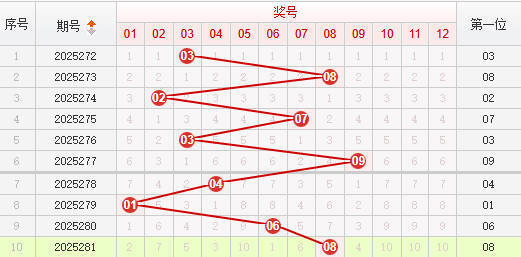 上期首位开出08码,属于偶数码,上期该位的奇偶比5:5,近5期偶出号较多,本期推荐关注奇数码。