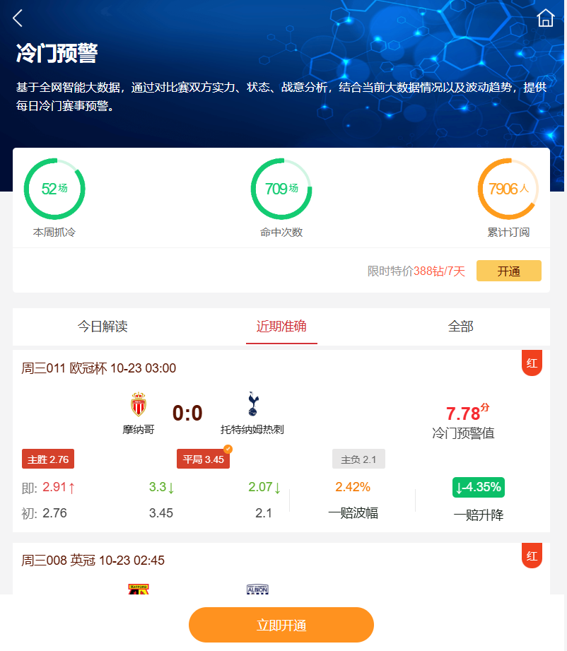 昨晚唯彩看球冷门预警工具再次成功预测3场比赛赛果,昨日欧冠摩纳哥VS热刺的比赛中,尽管初始赔率显示热刺占优(胜平负赔率2.1:3.45:2.76),但比赛最终以0-0爆冷战平;英冠沃特福德2-1胜西布罗姆维奇、亚冠江原FC4-3胜神户胜利船两场爆冷同样命中。一众预测充分展现了我们工具的精准预测能力。