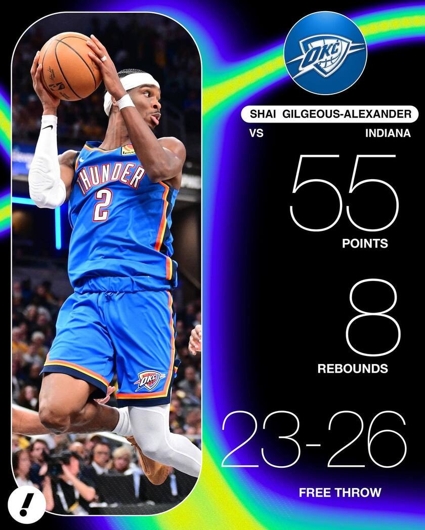 全场比赛,亚历山大罚球26中23,罚球得分占其总得分55分的近一半。他的罚球数甚至超过了步行者全队罚球数(40次)的一半。