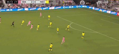 随后,梅西有一次角球直接转向球门后点,皮球击中立柱弹出。比赛进入补时阶段,第90+7分钟,阿尔巴传中被扑出,梅西补射破门完成双响,迈阿密国际3-0领先。