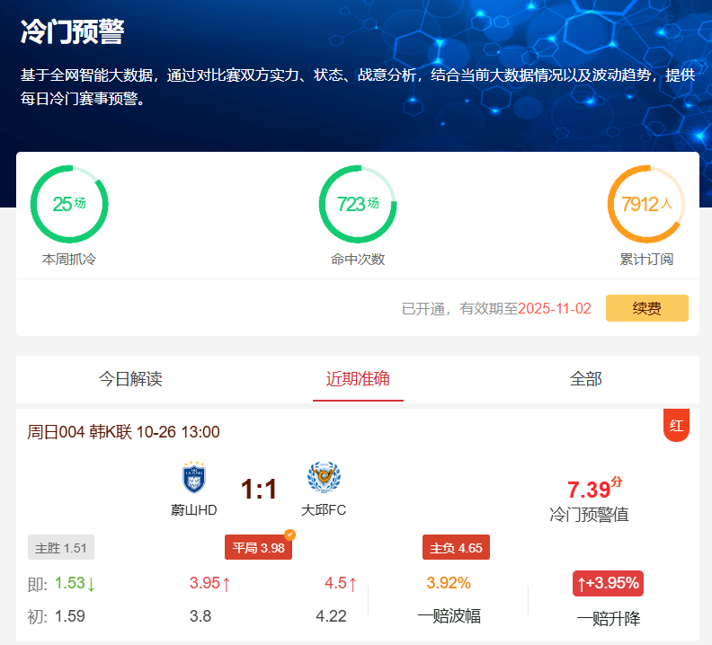 昨晚唯彩看球冷门预警工具再次成功预测6场比赛赛果,今日早场韩职蔚山HD VS大邱FC的比赛中,尽管初始赔率显示蔚山HD占优(胜平负赔率1.51:3.98:4.65),但比赛最终以1-1爆冷战平;昨晚西甲毕尔巴鄂竞技0-1负赫塔菲、意甲那不勒斯3-1胜国际米兰以及早场韩职水原FC 1-2负济州SK等六场爆冷同样命中。一众预测充分展现了我们工具的精准预测能力。