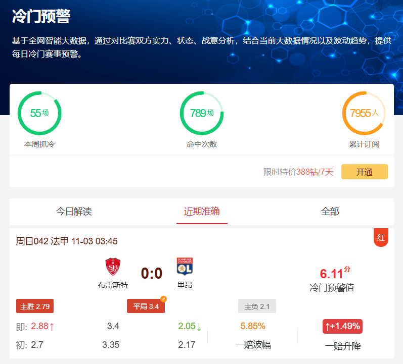 昨晚唯彩看球冷门预警工具再次成功预测13场比赛赛果,昨日法甲布雷斯特VS里昂的比赛中,尽管初始赔率显示里昂占优(胜平负赔率2.79:3.4:2.1),但比赛最终打出了0-0平的冷门;同时早场日乙鸟栖沙岩0:0平德岛漩涡、韩职水原FC1-1平大邱FC、澳超中央海岸水手1:1平惠灵顿凤凰的三连平冷门以及英超的西汉姆联3-1纽卡斯尔联(胜平负赔率5:3.9:1.49)等多场冷门结果同样命中。一众预测充分展现了我们工具的精准预测能力。
