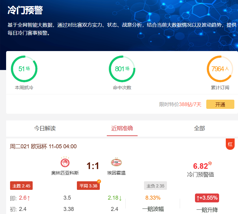 昨晚唯彩看球冷门预警工具再次成功预测6场比赛赛果,昨日奥林匹亚科斯VS埃因霍温的比赛中,尽管初始赔率显示双方分胜负概率较大(胜平负赔率2.45:3.38:2.35),但比赛最终打出了1-1平的冷门;同时早场亚冠首尔FC0:0平成都蓉城以及英冠布里斯托城0-1负布莱克本、莱斯特城1:1平米德尔斯堡还有欧冠博德闪耀0-1负摩纳哥、尤文图斯1-1平葡萄牙体育等多场冷门结果同样命中。一众预测充分展现了我们工具的精准预测能力。