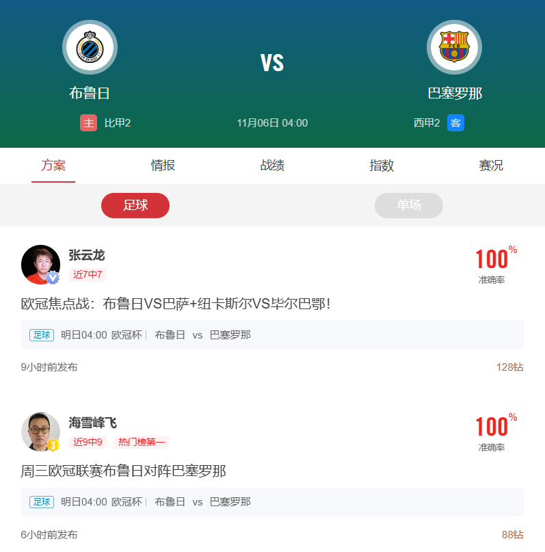 周三017欧冠推荐:布鲁日VS巴塞罗那