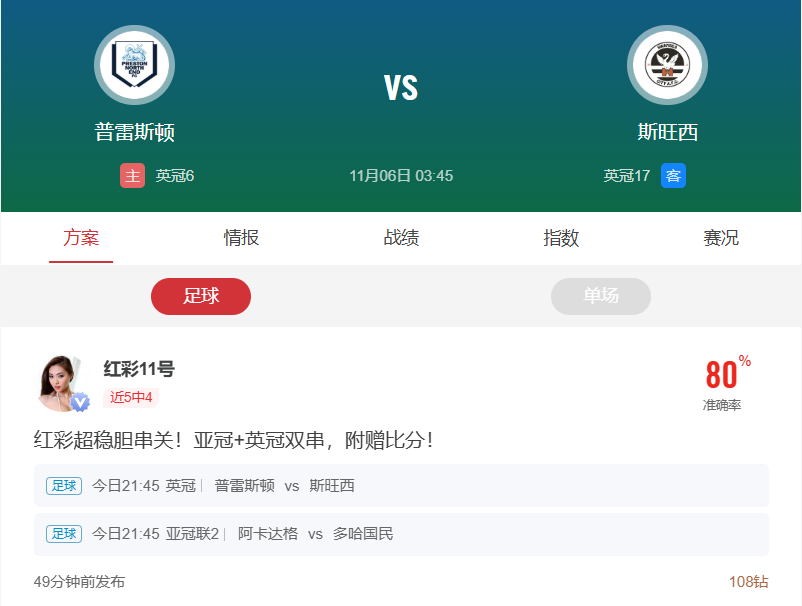 周三012英冠推荐:普雷斯顿VS斯旺西