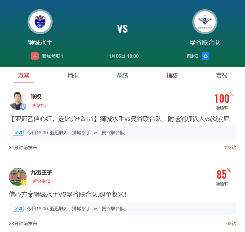 周四001亚冠乙推荐:狮城水手VS曼谷联