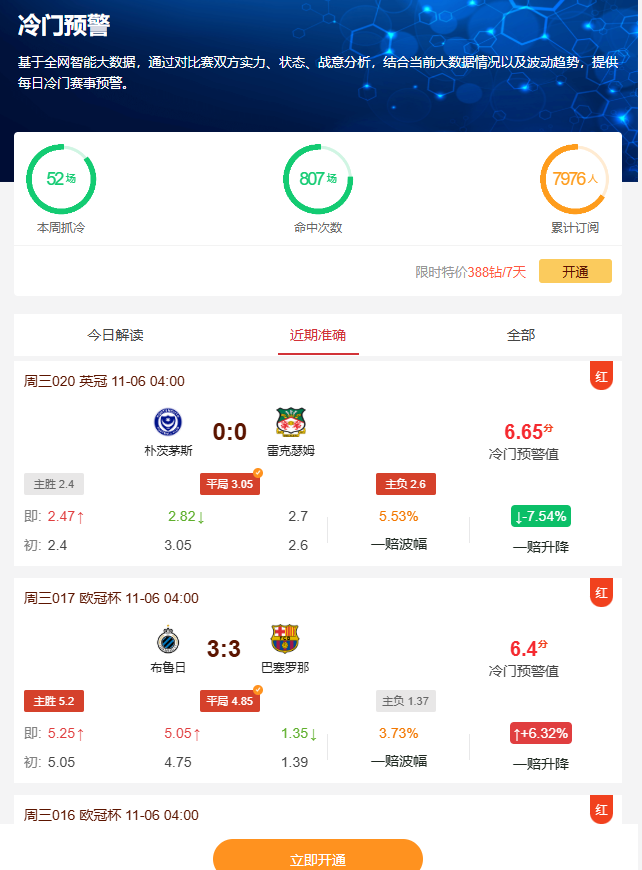 昨晚唯彩看球冷门预警工具再次成功预测6场比赛赛果,昨日英冠朴茨茅斯VS雷克瑟姆的比赛中,尽管初始赔率显示双方分胜负概率较大(胜平负赔率2.4:3.05:2.6),但比赛最终打出了0-0平的冷门;同时早场亚冠乙阿卡达格1:1平多哈国民、迪拜祈祷2:2平慕哈瑞克以及欧冠帕福斯1-0胜比利亚雷亚尔、马赛0-1负亚特兰大还有布鲁日3-3平巴塞罗那等多场冷门结果同样命中。一众预测充分展现了我们工具的精准预测能力。