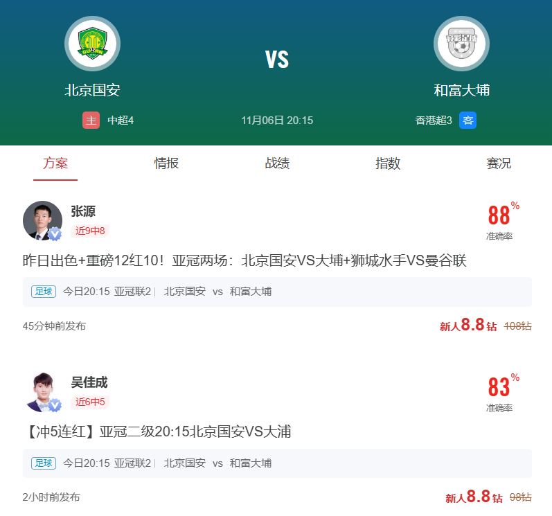周四005亚冠乙推荐:北京国安VS和富大埔