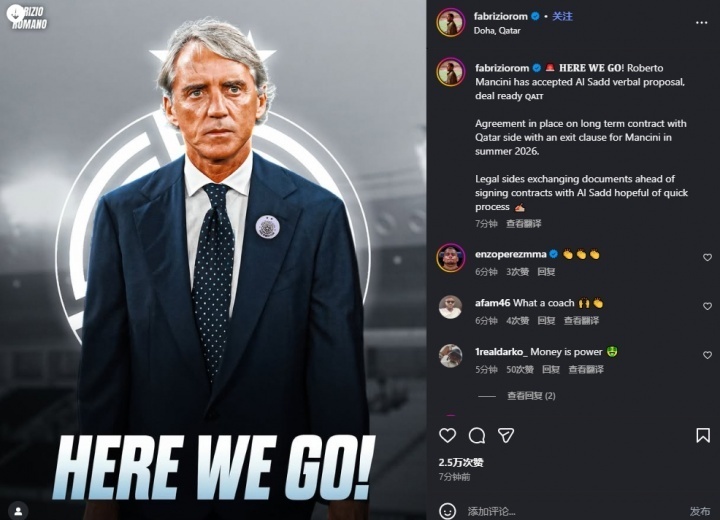 唯彩看球讯 2025年11月11日,名记罗马诺以标志性的“here we go!”确认,意大利名帅曼奇尼已接受卡塔尔阿尔萨德俱乐部的口头邀约,双方交易基本敲定,即将开启合作篇章。