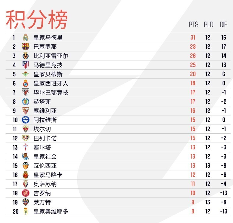 积分榜中游竞争白热化,从第5名皇家贝蒂斯(20分)到第13名皇家社会(13分)仅差7分,每场比赛都可能改变排名格局。