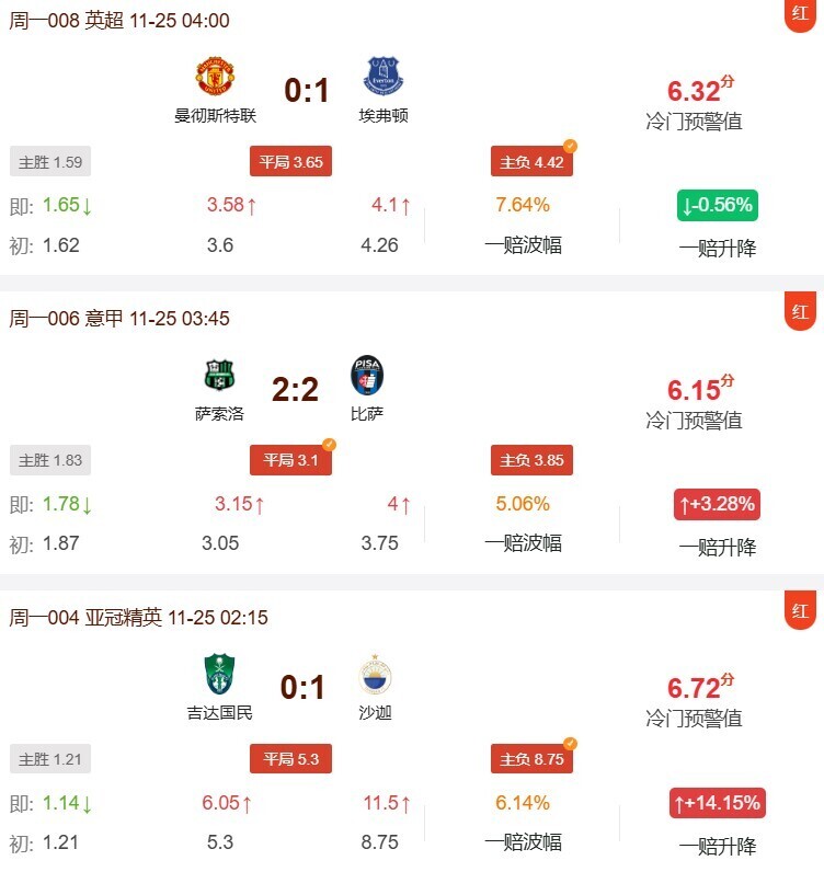 北京时间11月25日,冷门预警为大家罗列各项足球让球胜平负和足球胜平负的赛事误差较大场次,各位球友敬请留意。