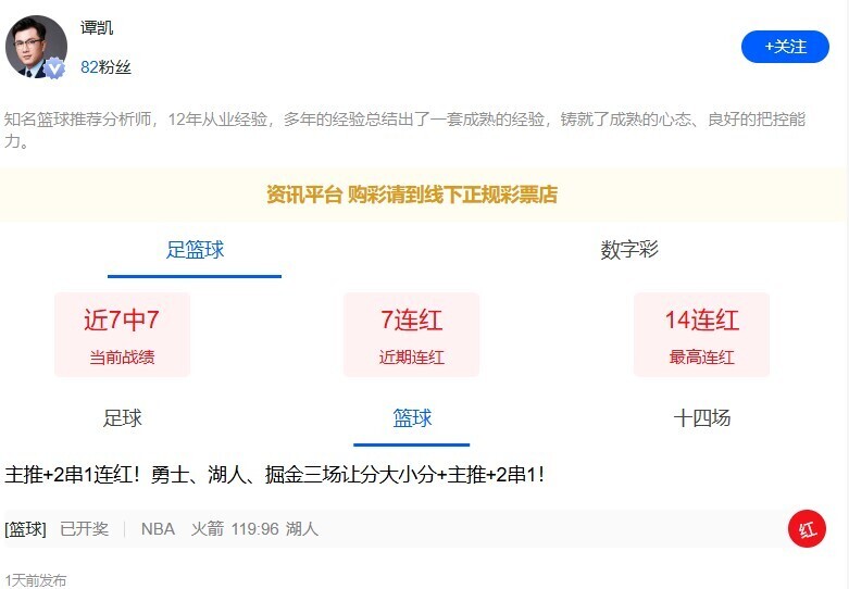 专家谭凯七连红!更多篮球信心场次推荐点点关注不迷路!