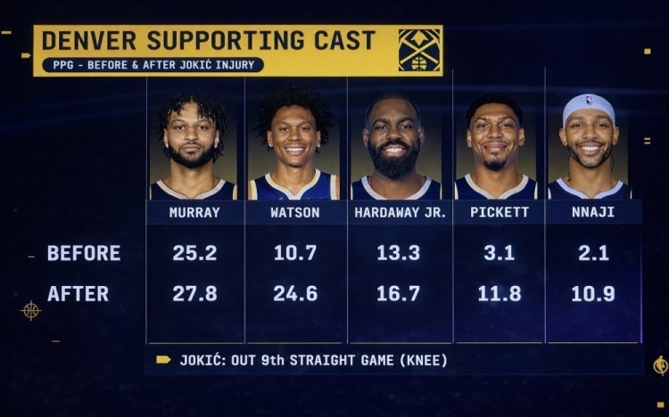 角色球员崛起:小哈达威、皮克特、纳吉等提供稳定输出,弥补约基奇与其他伤员空缺。