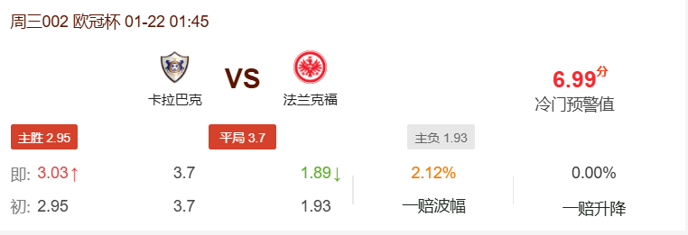 周三002欧冠推荐:卡拉巴赫VS法兰克福