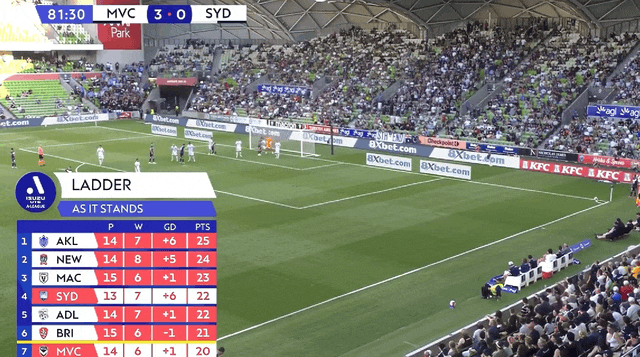 墨尔本胜利豪取关键3分,排名升至联赛第7,距离季后赛区域仅1分之差,士气大振。
