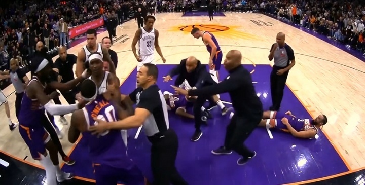 唯彩看球讯 北京时间2026年1月28日,NBA两场常规赛(太阳vs篮网、雷霆vs鹈鹕)均爆发大规模冲突,前者比赛中5人吃技犯,后者终场后双方互揪衣领、场面失控,具体经过与判罚/后续如下: