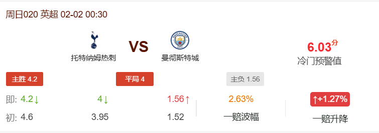 数据层面给予曼城客胜1.56的赔率支持,这符合其争冠球队的定位和实力对比。曼城整体实力和近期势头占据明显上风,是更被看好的一方。相比之下,热刺状态萎靡且伤病满营。然而数据的初始定位与后续调整却透露出一些疑虑。一方面,机构对曼城大胜的支持力度并不坚决;另一方面,某些数据对主场疲软的热刺给出了与基本面不符的支持。考虑到热刺在主场对阵曼城时往往能激发出额外战斗力,而曼城在客场存在防守隐患且近期交锋心理不占优,本场比赛存在一定的冷门空间。综合来看,尽管曼城实力占优,但状态低迷、阵容不整的热刺,在主场凭借历史交锋的心理优势和对手的客场不稳定因素,有能力制造冷门,或能保住主场不败。
