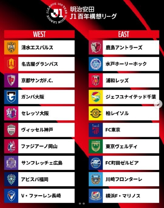 东西分区:20支J1球队根据地理位置分为东、西两个赛区,每个赛区10支球队进行主客场双循环。