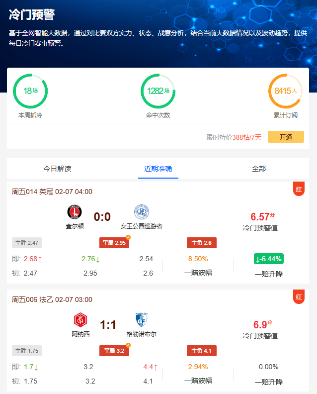 昨日英冠查尔顿VS女王公园巡游者的比赛中,尽管初始赔率显示双方分出胜负的概率较大(胜平负赔率2.47:2.95:2.6),但比赛最终打出了0-0平的冷门。同时法乙阿纳西1-1平格勒诺布尔(胜平负赔率1.75:3.2:4.1)的比赛也同样命中。比赛赛果充分展现了我们工具的精准预测能力。